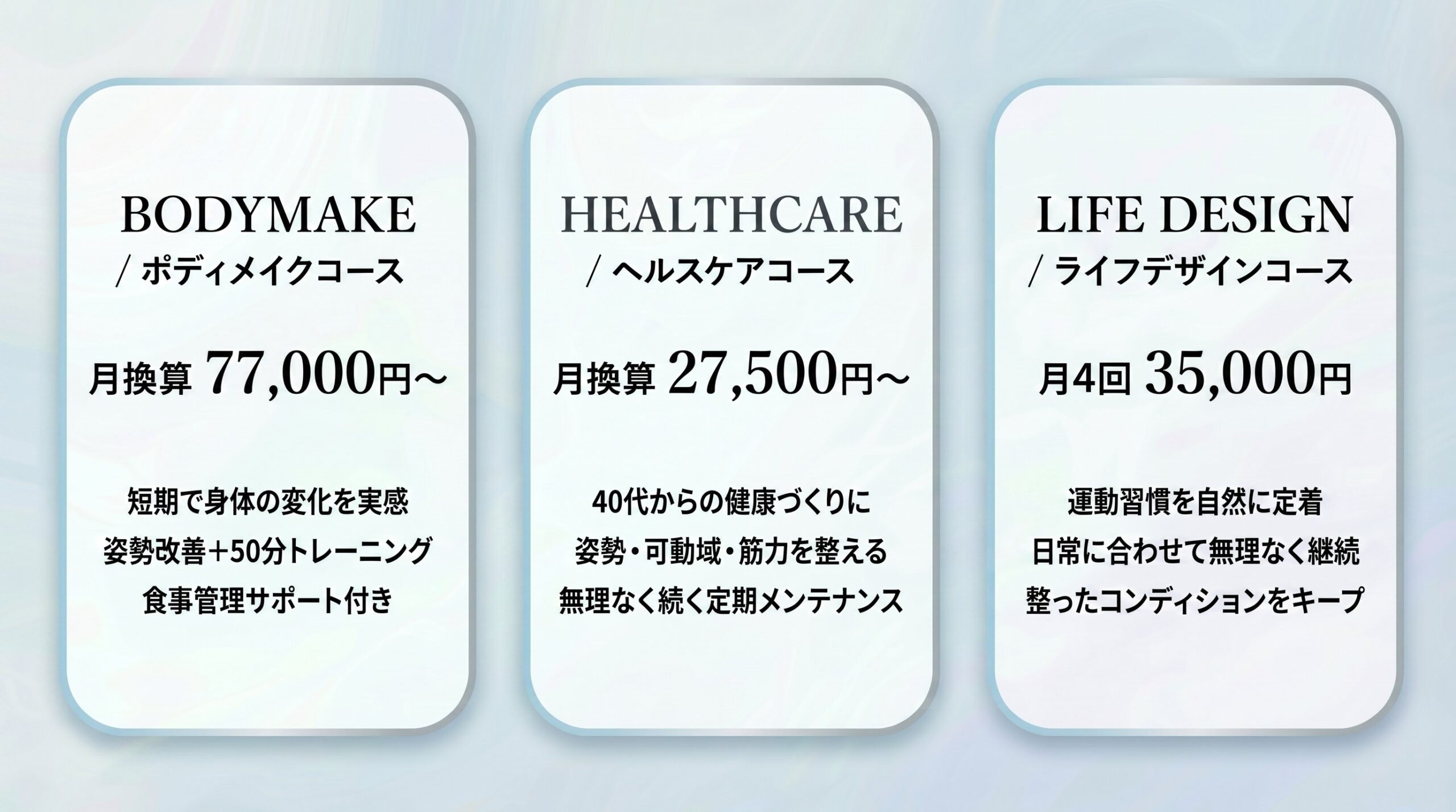 その日の姿勢・可動域・疲労状態を確認しながら、整える動きと適切な負荷を組み合わせたセッションを提供。